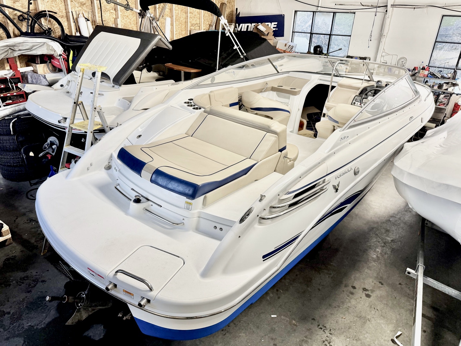 Båten er lagret inne i vinter som avbildet 23 november 2025, og kan besiktiges/leveres etter avtale.